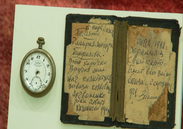 "Я привезла некоторые экспонаты, которые касаются моего деда Ивана Васильевича Панфилова. Это книга из его личной библиотеки 1936 года издания, часы. Но самая ценная, на мой взгляд, вещь - это корочка от партбилета, которую передал комиссар Логвиненко водителю моего деда, когда тот погиб. И водитель всю войну носил как талисман ее, и хранил уже свой партбилет в этой корочке, затем передал в нашу семью. Также мы передали оригиналы двух грамот о присвоении звания Героя Советского Союза двоим из 28 панфиловцев, фотографию Бауржана Момышулы с его автографом. Кроме того, уникальными являются оригиналы знамен воинских частей из 301-й, 310-й и 312-й дивизий, а также 768 истребительно-авиационного полка, который был сформирован в Шымкенте. Это знамена, которые с 41-го года прошли всю войну", - рассказывает внучка Героя Советского Союза Ивана Панфилова Алуа Байкадамова.