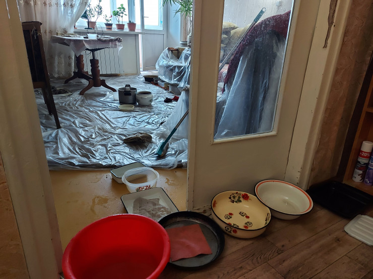 "Мне 76 лет, мужу 83 года. Через каждые два часа я сливаю воду из емкостей в унитаз, чтобы вода не лилась на пол. Всю мебель пришлось закрыть целлофаном. В КСК обращались, но там ничего не делают. Просим их хотя бы убрать с крыши снег. Там его очень много скопилось, и сейчас он тает. Электрощиток постоянно замыкает. Это опасно для жизни. Может вспыхнуть пожар", - рассказала пенсионерка Любовь Акимова.