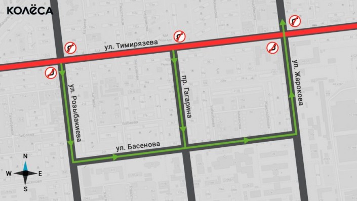 Во всех остальных случаях, чтобы повернуть налево, водителям придется обходиться правыми поворотами и объездом по соседним улицам. Вот как, например, нужно двигаться, чтобы попасть на Жарокова ниже Тимирязева: