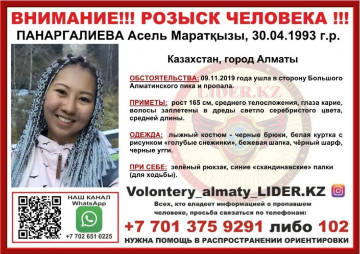 Асель Панаргалиева пропала в горах Алматы 9 ноября 2019 года. Полицейские начали разыскное дело. 12 ноября спасатели прекратили поиски пропавшей туристки. Однако в тот же день родственники обратились с просьбой продолжить поисково-спасательную операцию. Ее возобновили утром 13 ноября, однако поиски не дали результатов.