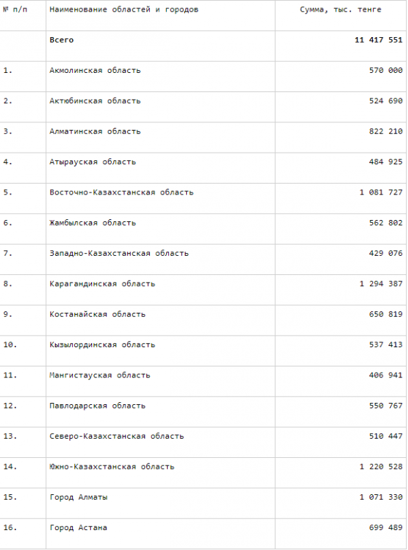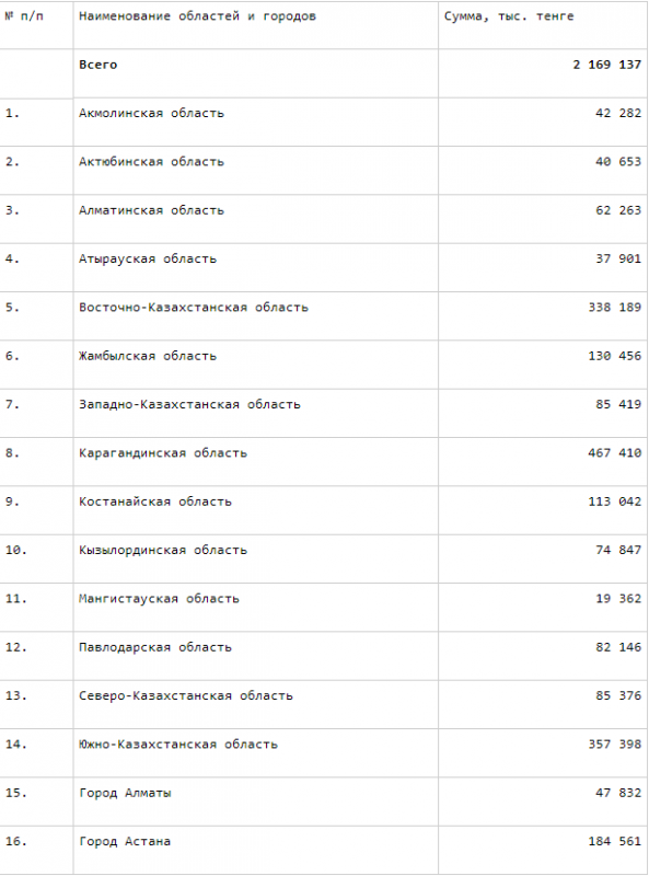 Наибольшее количество средств получит Карагандинская область - 1,293 миллиарда тенге. На втором месте по этому показателю расположилась Южно-Казахстанская область - 1,220 миллиарда тенге, на третьем - Восточно-Казахстанская область  с показателем 1,081 миллиарда тенге.