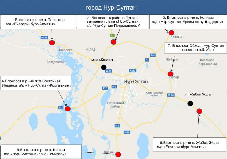 Заместитель акима Нур-Султана Бахтияр Макен рассказал, что по периметру столицы установлены шесть блокпостов в районе поселков Талапкер, Караоткель (Ильинка), Коянды, Косшы, Жибек-Жолы, на участке автодороги Нур-Султан - Петропавловск. Также дополнительно акиматом Акмолинской области блокпост установлен в районе поселка Шубары.