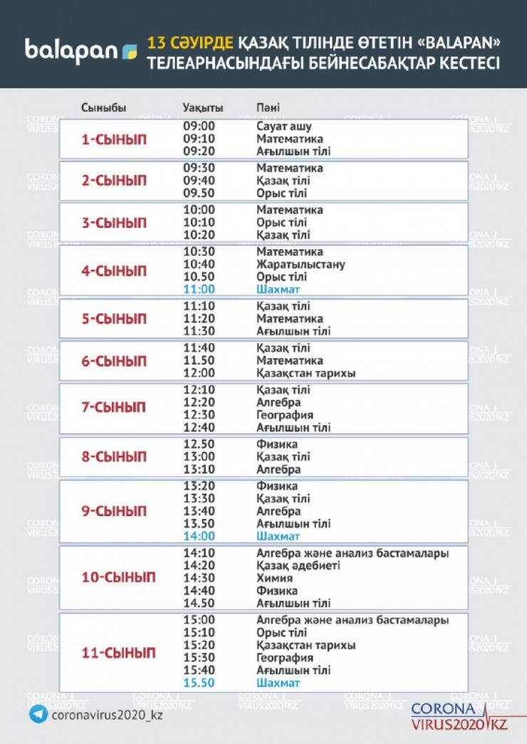 Расписание телеуроков для 1-11 классов с казахским языком обучения на телеканале BALAPAN.