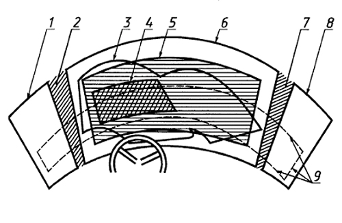 Обозначения: 1 - граница прозрачной части левого бокового окна, 2 - левая боковая стойка переднего окна, 3 - контур очистки переднего окна, 4 - граница нормативной зоны А, 5 - граница нормативной зоны Б, 6 - граница прозрачной части переднего окна, 7 - правая боковая стойка переднего окна, 8 - граница прозрачной части правого бокового окна, 9 - следы от плоскостей, являющихся границами нормативного поля обзора П.