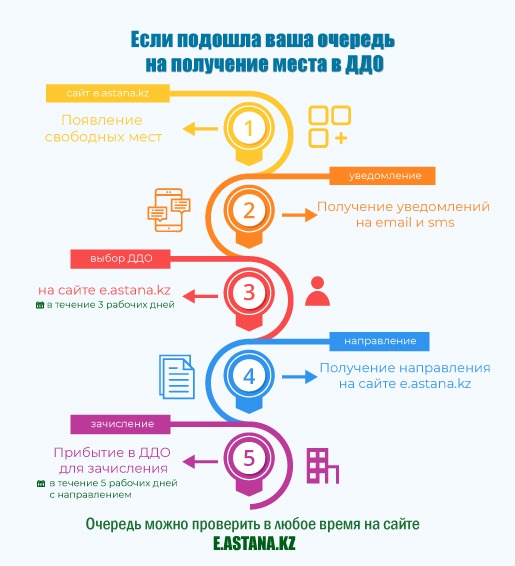 "Допустим, подошла ваша очередь в детский сад. У нас это высветилось, и вы сразу же получаете уведомление в виде SMS или письма на почту о том, что освободилось место в детском саду. После этого у вас есть три рабочих дня, чтобы подать заявку на сайте "электронного акимата", если вам данное место интересно", - пояснила замакима. Она подчеркнула, что у тех родителей, которые не успели выбрать места за этот срок, право на выбор детского сада и первоначальная очередность сохраняются.