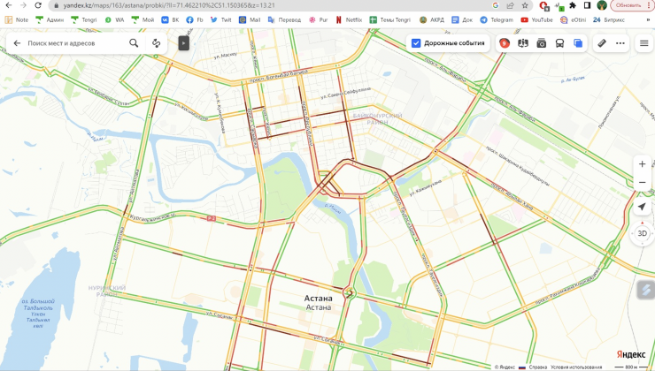 По данным поисково-информационной картографической службы Яндекс, в Астане отмечаются 9-балльные пробки.
