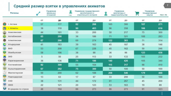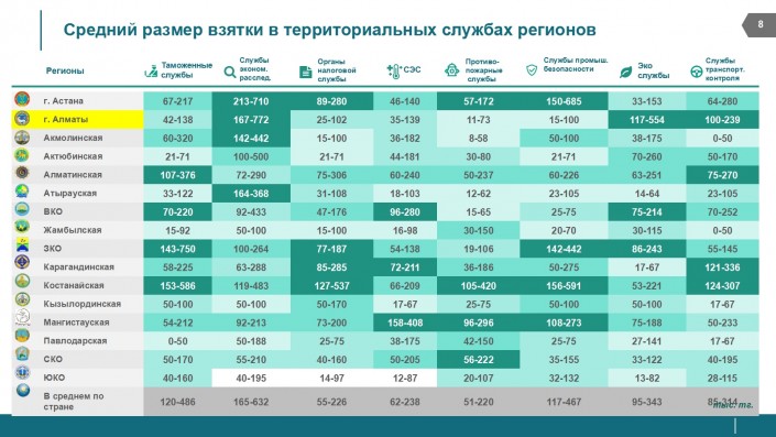 "В списке одни и те же управления и ведомства. С разницей только в стоимости услуг. Больше всех за быстрое решение проблем готовы заплатить предприниматели в Алматы и Астане. В два-три раза ниже мзда в других регионах", - отмечают в НПП.