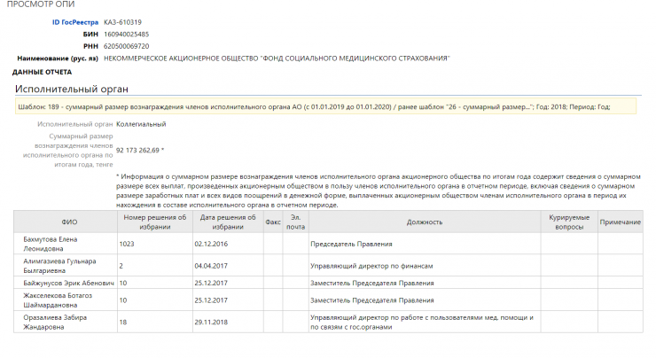 По информации о суммарном размере вознаграждения членов исполнительного органа акционерного общества по итогам 2018 года стало известно, что пяти членам исполнительного органа было выплачено вознаграждение в общей сумме 92 173 262,69 тенге. В 2018 году председателем правления Фонда соцмедстрахования значилась Елена Бахмутова. Она и еще четыре человека, которые являются членами исполнительного органа, получили премии. На вопрос, за какие заслуги было выплачено пяти членам исполнительного органа более 92 миллионов тенге, в фонде журналистам Liter.kz ответили неоднозначно.