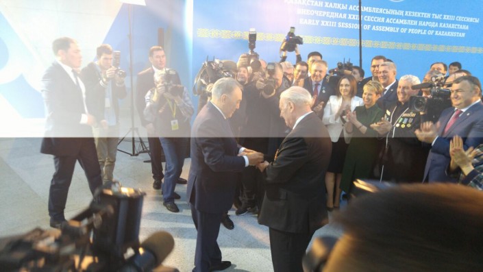 Президент РК в ходе внеочередной XXIII сессии Ассамблеи народа Казахстана подарил свои часы ветерану войны, сообщает корреспондент Tengrinews.kz.
