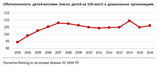 На конец 2016 года на 100 мест было зарегистрировано по 106 детей соответствующего возраста.