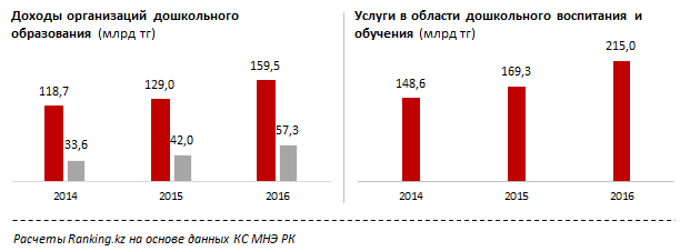 Основной объем услуг в области дошкольного образования оказывается за счет бюджета - 164,4 миллиарда тенге в 2016 году. Для сравнения, за счет населения услуг в секторе было оказано на 50,2 миллиарда тенге, предприятий - на 409,3 миллиона тенге.