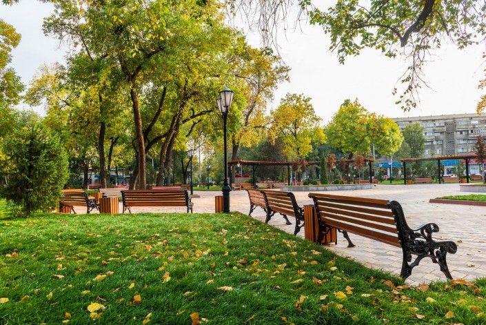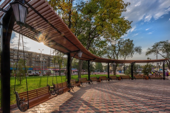 Здесь уложили тротуарную плитку, расширили площадь озеленения и высадили более 40 деревьев. Также установили малые архитектурные формы, обновили облицовку памятника Алиби Жангильдину и установили камеры видеонаблюдения.
