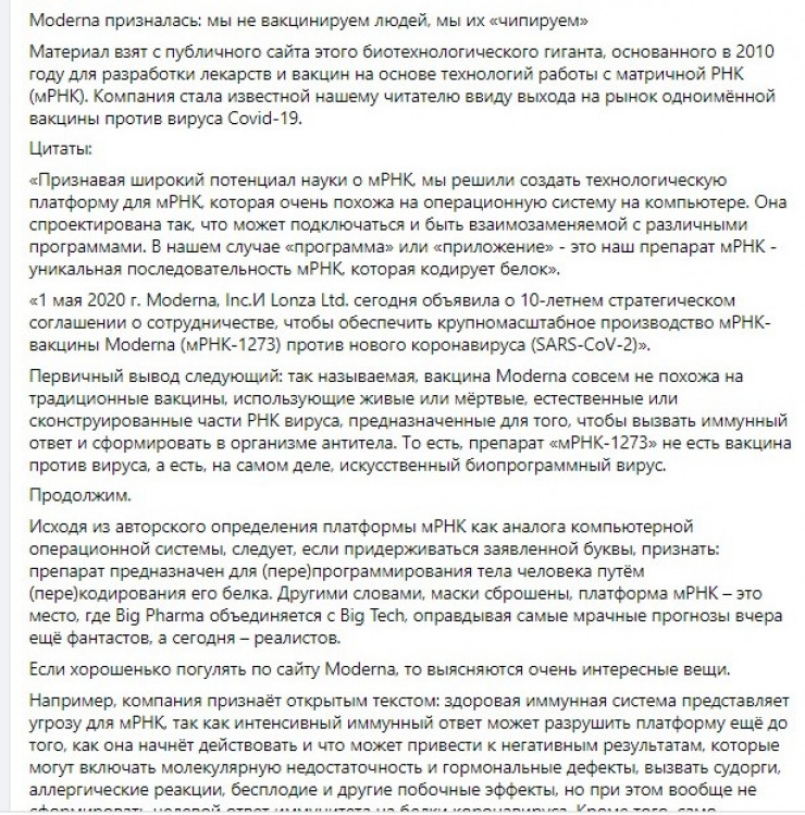 Как отмечает портал, оригинал текста о "признании" в чипировании людей был размещен в блоге конспиролога Александра Дубровского. В тексте он приводит некоторые цитаты с официального сайта компании Moderna, добавляет в них собственные идеи и затем интерпретирует их.