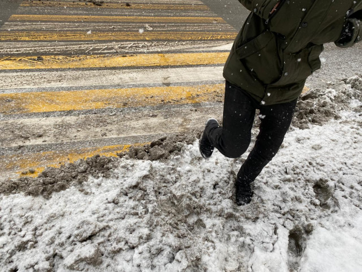 Переходим через дорогу, под ногами грязь и слякоть. Коммунальные службы выгребают снег на края дороги.