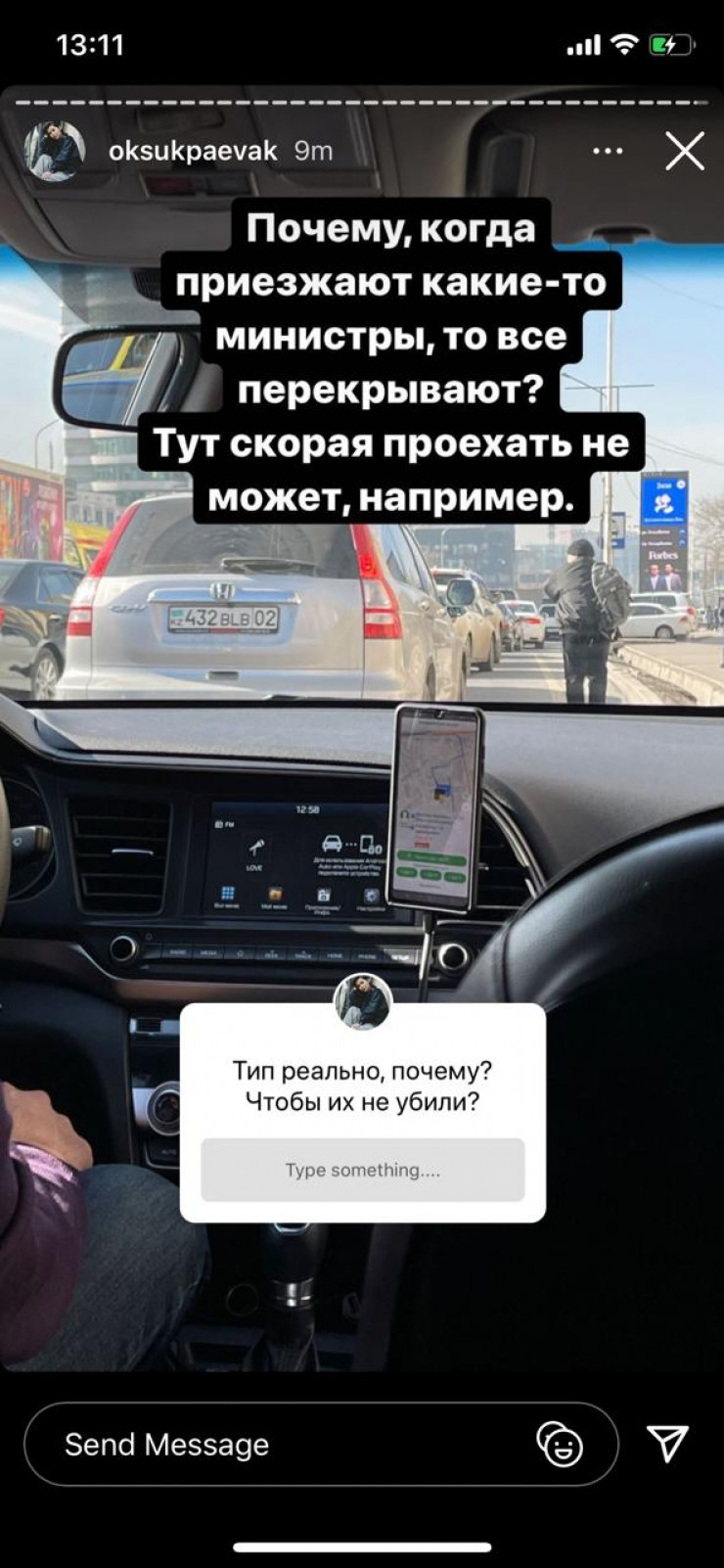 Блогер Карина Оксукпаева написала в Stories в Instagram, что скорая помощь не могла проехать к пациенту из-за образовавшейся пробки.