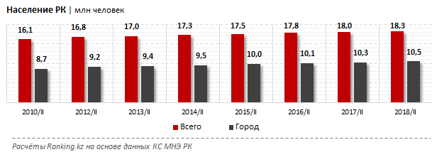 По официальным данным, за год количество очередников на льготное жилье по различным госпрограммам выросло с 2,5 до 2,8 миллиона (с 2016 по 2017 год). Очевидно, что в среднесрочной перспективе (2-3 года) эта аудитория будет увеличиваться быстрыми темпами. Причины - высокий демографический рост и активная урбанизация. Со второго квартала 2017-го по второй квартал 2018-го население Казахстана в целом увеличилось на 238 тысяч человек. Горожан стало больше на 190 тысяч.