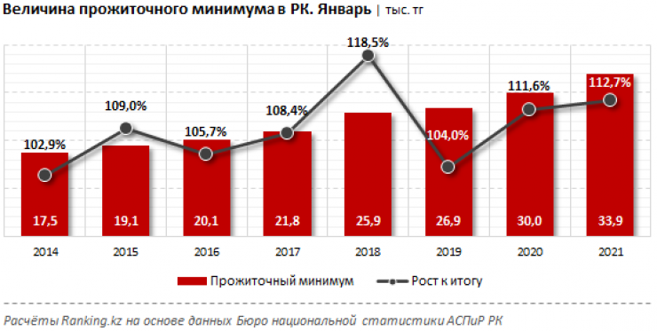 Сообщается, что в январе величина прожиточного минимума составила 33,9 тысячи тенге - на 12,7 процента больше, чем в аналогичном периоде 2020 года. В свою очередь, цены на товары и услуги выросли на 7,4 процента.