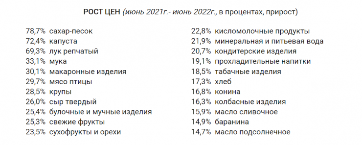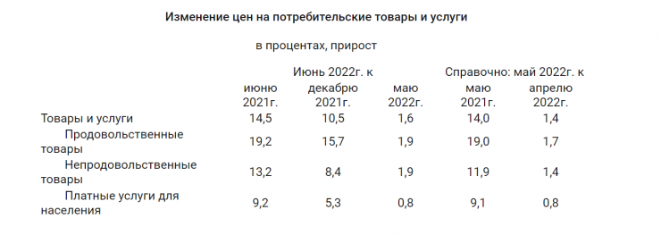 "Инфляция в июне в годовом исчислении составила 14,5 процента, за месяц - 1,6 процента. Цены на продовольственные товары в июне 2022 года по сравнению с июнем прошлого года повысились на 19,2 процента", - говорится в сообщении.