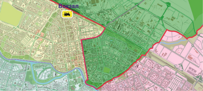Восточная граница проходит по реке Акбулак, далее по улице 101 (проектное наименование), далее по улице восточнее улицы Пушкина (A-344), далее по реке Акбулак;
