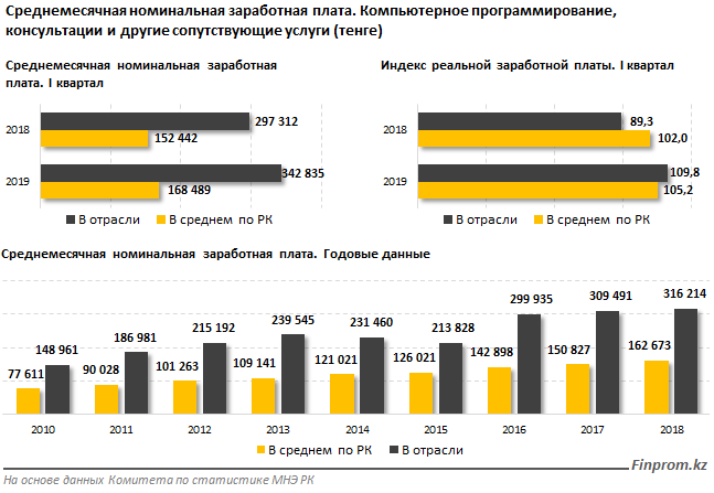 Заметим, что заработная плата специалистов по компьютерному программированию, консультациям и другим сопутствующим услугам значительно превосходит среднереспубликанский уровень: по итогам I квартала текущего года — 342,8 тысячи против 168,5 тысячи тенге.