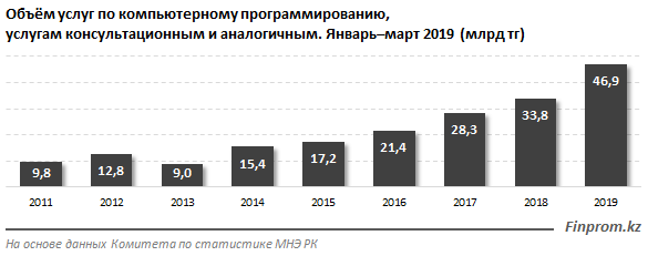 Спрос на услуги по компьютерному программированию, консультационные и прочие в секторе растет шестой год подряд. За январь-март 2019 года объем услуг достиг уже 46,9 миллиарда тенге, увеличившись за год на 38,7 процента. Индекс физического объема к прошлому году составил 133,6 процента.
