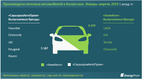 В Казахстане выпускаются такие автомобили, как LADA, Skoda, Chevrolet и KIA, Chevrolet, Hyundai, JAC, Peugeot и Ravon.
