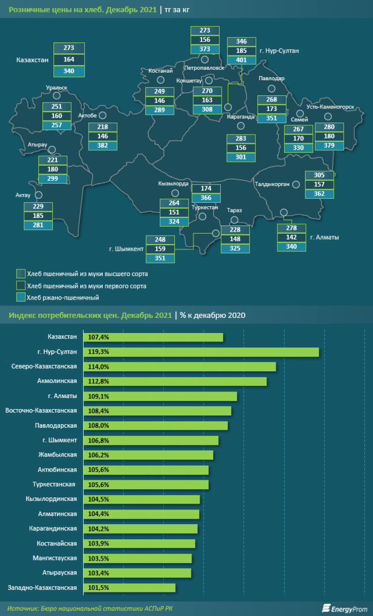 Среди регионов за год хлеб наиболее подорожал в Нур-Султане (19,3 процента), а также в Северо-Казахстанской (на 14 процентов) и Акмолинской (на 12,8 процента) областях. Среди крупных городов самый дорогой хлеб в столице, самый дешевый пшеничный хлеб из муки высшего сорта - в Актобе.