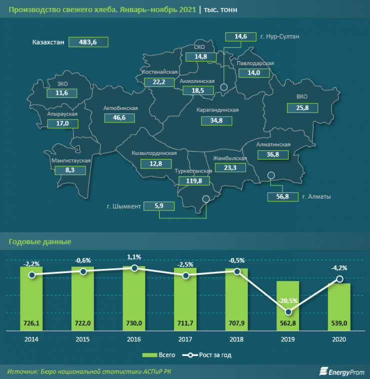 Аналитики сообщили, что с января по ноябрь 2021 года в стране произвели 483,6 тысячи тонн хлеба, что почти на 15 процентов меньше, чем год назад. Больше всего хлеба произвели в Туркестанской области: 119,8 тысячи тонн. В тройке лидирующих регионов также оказались Алматы (56,8 тысячи тонн) и Актюбинская область (46,6 тысячи тонн). Как отмечено в анализе, в 2020 году производство хлеба упало на 4,2 процента и это продолжается уже пятый год подряд.