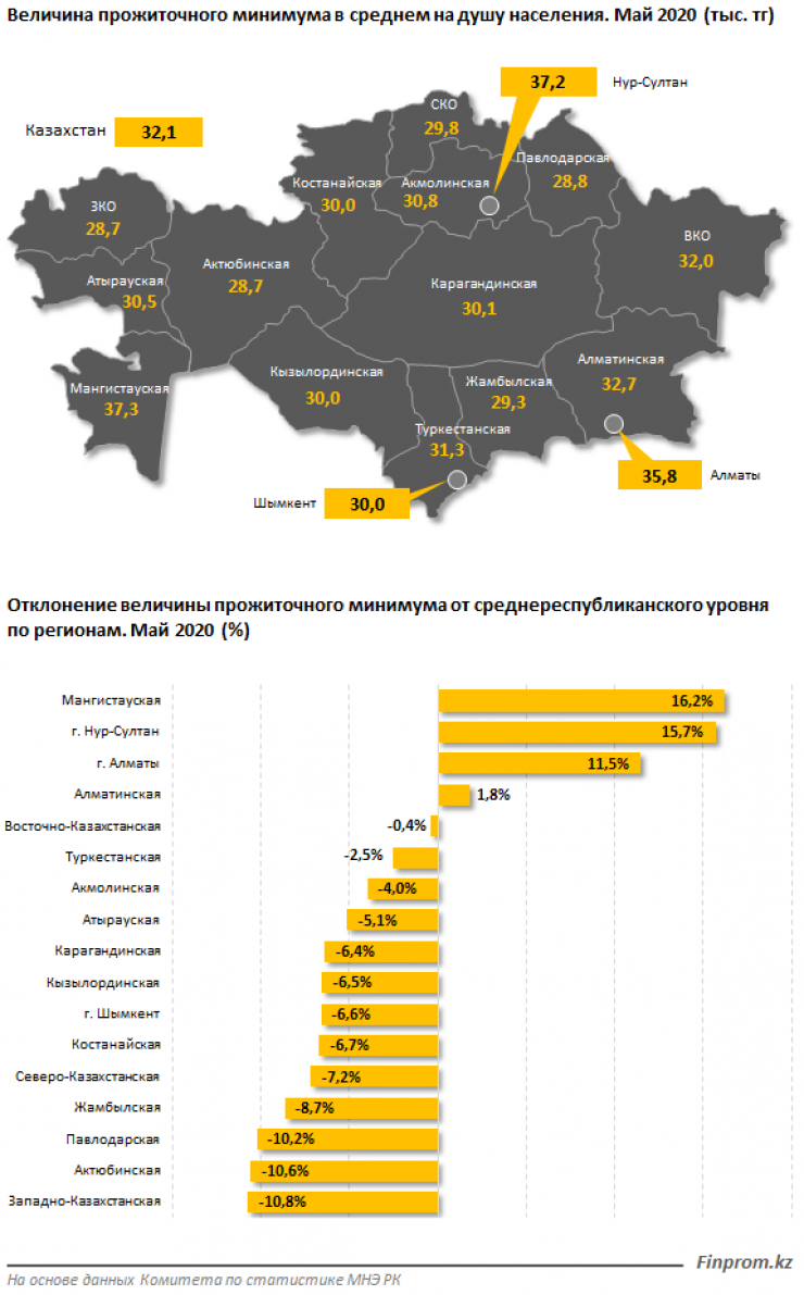 В мае 2020 года самый высокий уровень прожиточного минимума традиционно наблюдался в Мангистауской области: 37,3 тысячи тенге - на 16,2 процента больше среднереспубликанского уровня. В Нур-Султане и Алматы прожиточный минимум составил 37,2 тысячи и 35,8 тысячи тенге, соответственно, что на 15,7 процента и 11,5 процента больше по сравнению со средним значением по РК. Также в топ-5 регионов вошли Алматинская (32,7 тысячи тенге) и Восточно-Казахстанская (32 тысячи тенге) области.