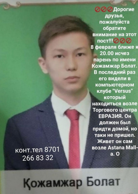 "Я подтверждаю, что он пропал. Мы не знаем, где он. Первые три дня к нему можно было дозвониться, но он не брал трубку. А потом в понедельник уже отключил номер. Он в пятницу ушел после обеда. Мальчики из его класса сказали, что играл в компьютерном клубе. Они сказали, что он поиграл, а потом Болат сказал: "Я домой иду, мне пора домой" и ушел. Домой не пришел", - сообщила мать школьника, отметив, что сын никогда ранее не уходил из дома.