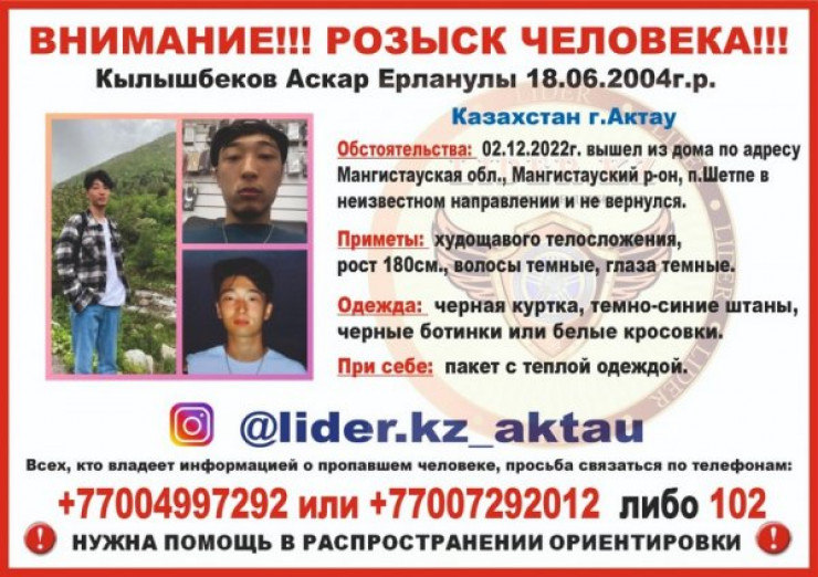 В Мангистауской области 10 дней разыскивают 18-летнего Аскара Кылышбекова, его родные обратились за помощью к волонтерам и в полицию, передает Tengrinews.kz со ссылкой на "Ладу".