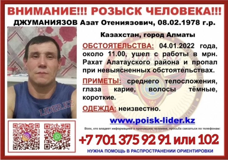 Четыре месяца жители Каракалпакстана (автономной республики в ​​составе Узбекистана) разыскивают своего пропавшего без вести родственника Азата Жуманиязова. По их словам, он уехал в Казахстан на заработки, но после январских событий связь с ним родные потеряли. В последний раз 44-летнего мужчину видели в районе рынка "Алтын Орда" в Алматы.