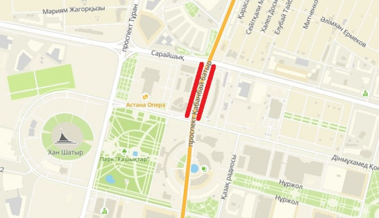 "В связи с проведением ремонтных работ с 22:00 27 августа по 31 августа будет полностью перекрыто движение для автотранспортных средств на участке проспекта Кабанбай батыра от улицы Конаева до улицы Сарайшык", - говорится в сообщении.