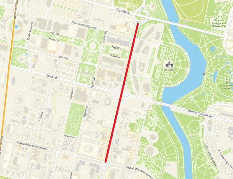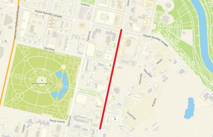 Кроме того, с 15 по 20 августа будет полностью перекрыто движение для автотранспортных средств на участке от улицы Керей-Жанибек хандар до улицы Бухар жырау.