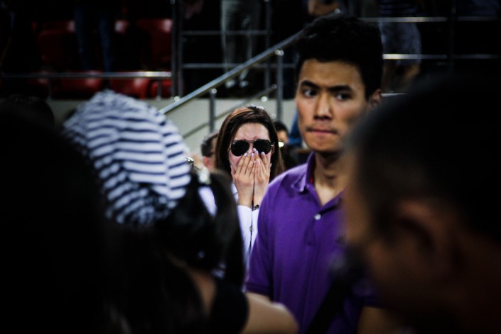 Народ рассаживается на трибуны - заняты все места, кроме южной стороны, перед которой проходит церемония прощания. Всего в зале около 3 000 мест, пространство зала тоже все заполнено. Некоторые, попрощавшись, выходят наружу через другие двери.