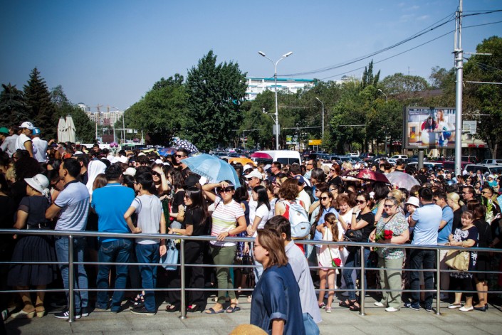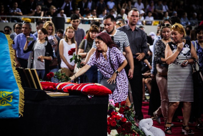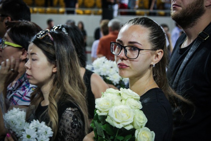 Около 10.00 открывают двери. На улице уже около 30 градусов. Медики на носилках уносят тех, кто упал в обморок от теплового удара. Очередь во Дворец спорта начинается от Центрального стадиона. Волонтеры делят желающих попасть внутрь на два потока. Внутрь пускают небольшими партиями. В соцсетях пишут, что некоторые за 2 часа так и не смогли пройти во дворец. Они повезли цветы к месту убийства Дениса на Курмангазы - Байсеитовой.