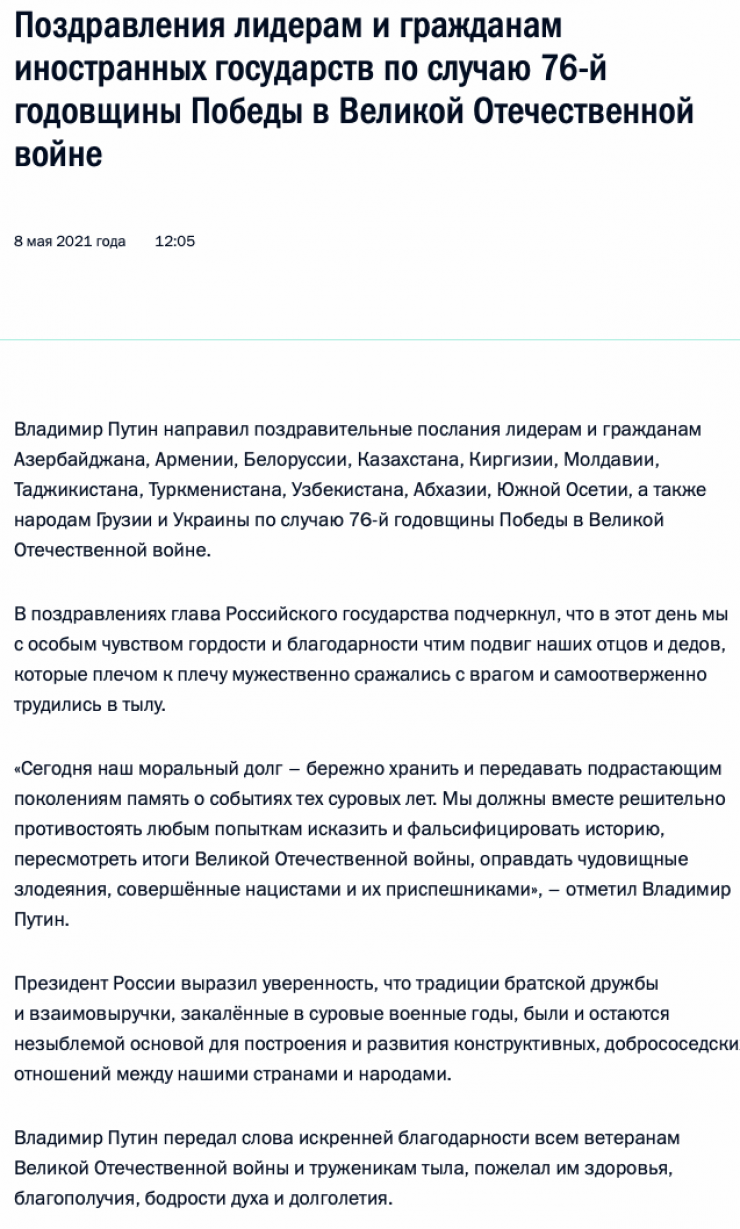 "Владимир Путин направил поздравительные послания лидерам и гражданам Азербайджана, Армении, Белоруссии, Казахстана, Киргизии, Молдавии, Таджикистана, Туркменистана, Узбекистана, Абхазии, Южной Осетии, а также народам Грузии и Украины по случаю 76-й годовщины Победы в Великой Отечественной войне", - говорится в сообщении Кремля.