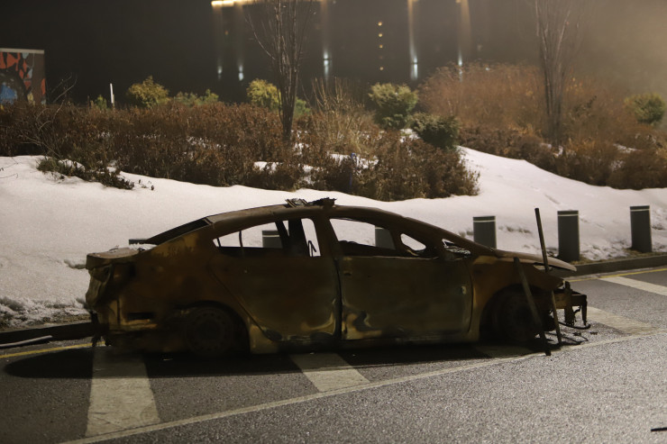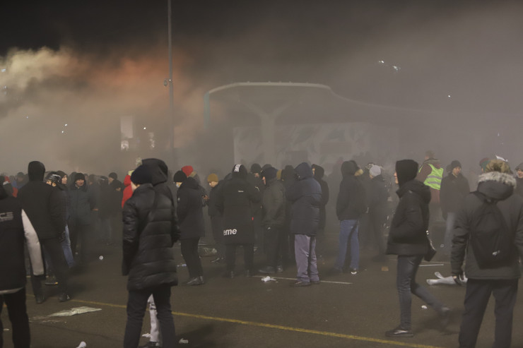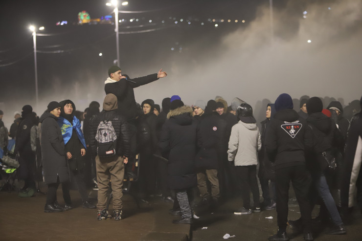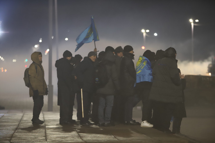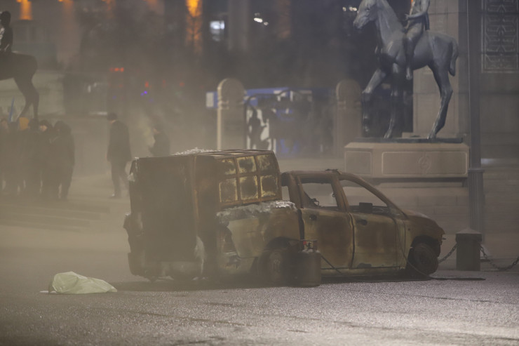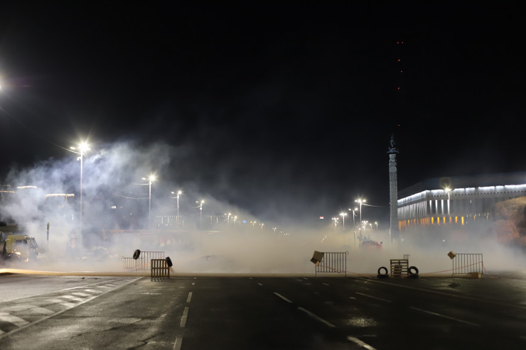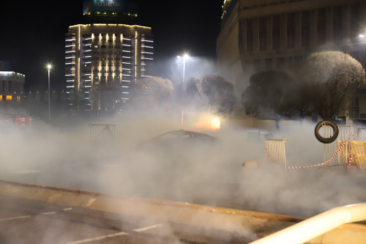 Площадь заволокло густым дымом. Тут и там перевернутые машины. В центре стоит толпа людей и скандирует лозунги. По бокам горит огонь. Со стороны может показаться, как будто события ночи с 4 на 5 января 2022 года повторились вновь. Этого эффекта и добивались авторы картины.
