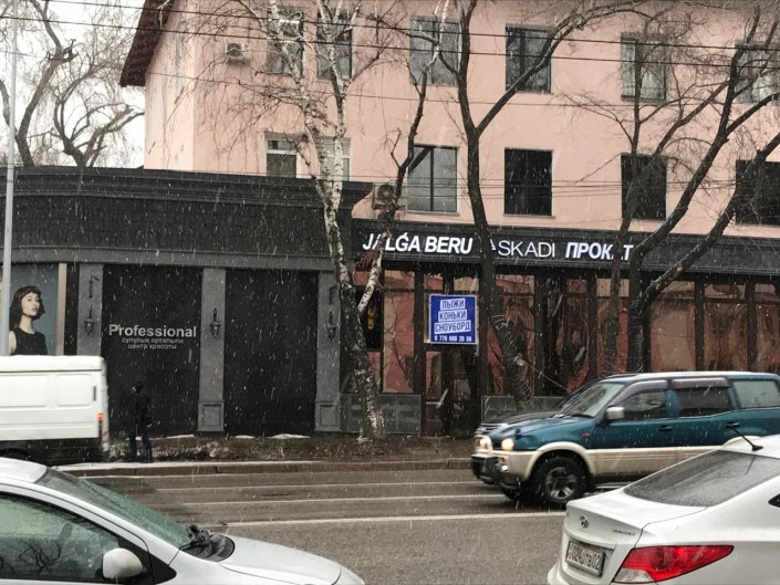 Прокат спортивного инвентаря (велосипеды, лыжи, коньки, сноуборды). На фасаде здания указано название Jalǵa beru.