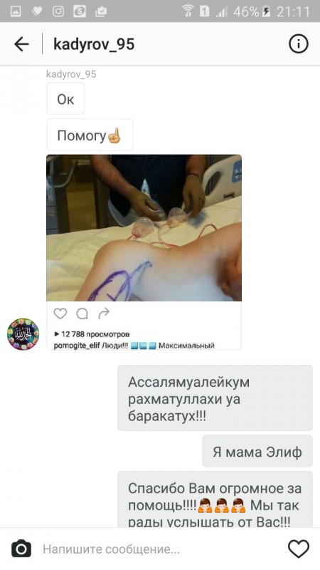 Женщина рассказала, что Кадыров сам написал в директ на страницу pomogite_elif в Instagram и пообещал помочь. А затем перевел деньги.