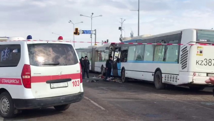 Массовая авария произошла в Нур-Султане 26 марта на проспекте Кабанбай батыра. Пригородный пассажирский автобус на скорости въехал в другой автобус. Это произошло в момент, когда все участники дорожного движения стояли на перекрестке, ожидая зеленый сигнал светофора. Также в результате столкновения были задеты одна легковая машина и карета скорой помощи.