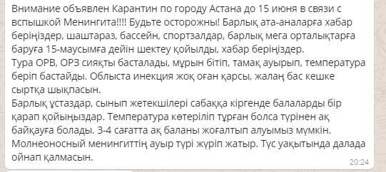 В мессенджерах распространяют ложное сообщение о том, что по Астане до 15 июня объявлен карантин.