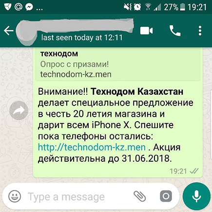 Казахстанцы начали получать очередную рассылку в WhatsАpp о бесплатных подарках. Так, в тексте рассылки говорится о том, что компания "Технодом" дарит  всем iPhone X в честь 20-летия Астаны.