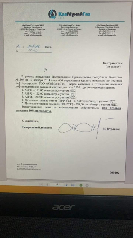 Ранее в Сети появилось фото документа, в котором "КазМунайГаз - Аэро" сообщает контрагентам о готовности поставки нефтепродуктов по талонной системе до конца 2020 года по ценам: АИ-92 - 181 тенге за литр; АИ-95 - 193 тенге за литр; АИ-98 - 212 тенге за литр; дизельное топливо летнее - 217 тенге; дизельное топливо зимнее - 299 тенге.