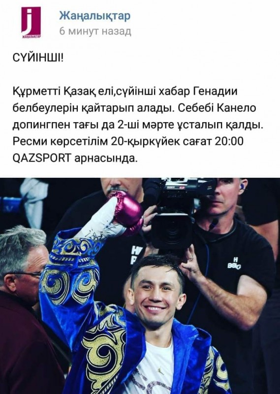 В Сети появилась информация о якобы возврате боксеру Геннадию Головкину чемпионских поясов, которых он лишился после проигрыша Саулю Альваресу, передает корреспондент Tengrinews.kz.