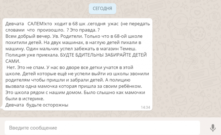 Ранее в WhatsApp появились сообщения о том, что якобы в столичной школе № 68 неизвестные похитили детей.