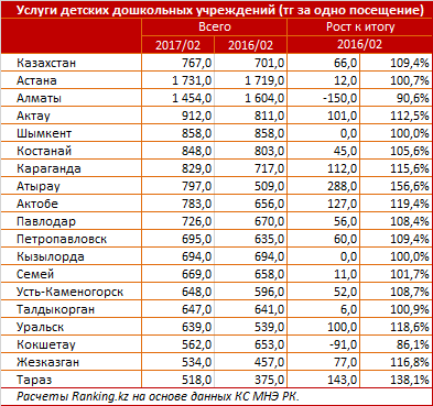 Дороже всего среди крупных городов и мегаполисов услуги детсадов и мини-центров обходились родителям малышей в обеих столицах: в Астане - 1731 тенге за посещение, +0,7 процента роста за год, в Алматы - 1454 тенге за посещение, минус 9,4 процента за год (это один из двух крупных городов, где услуги за год показали удешевление; второй - Кокшетау, минус 3,9 процента, до 562 тенге за посещение). Дешевле всего посещение дошкольных заведений стоило маленьким жителям Тараза - 518 тенге, +38,1 процента за год.