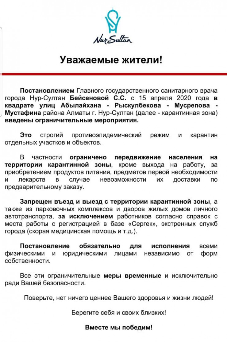 По информации акимата столицы на 12:30, карантин в этом квадрате введен в 10 домах.