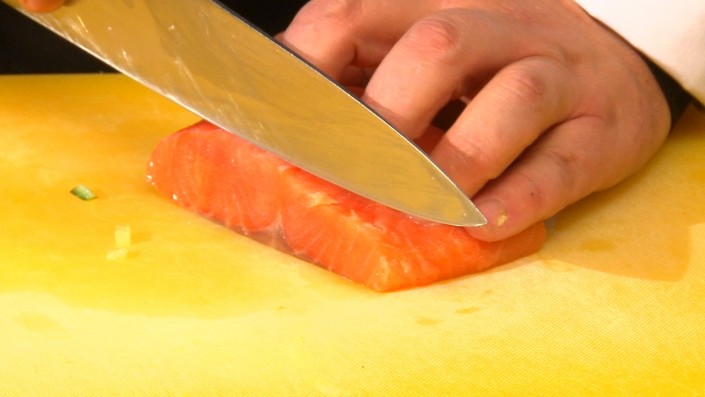 Основной ингредиент в салате - это около 200 грамм филе копченой семги. В целом, повар отмечает, что для этого блюда подойдет и любая другая соленая рыба. Все ингредиенты нарезаются небольшими кубиками, за ориентир шеф советует взять размер одного горошка, а после добавляются в емкость небольшими раздельными горстями. Это делается для того, чтобы можно было следить за пропорциональным количеством всех ингредиентов. Рыба хорошо сочетается с зеленью, поэтому шеф советует добавить немного укропа.