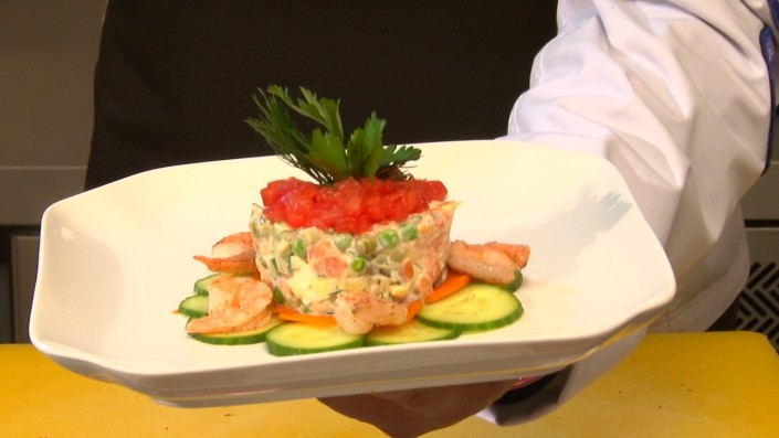 Свое оригинальное оливье он решил сделать с добавлением рыбы и креветок. Для его приготовления понадобились около 100 грамм отварного картофеля, столько же отварной моркови, соленых (не маринованных) огурцов, свежих огурцов, два отварных яйца. Для красивого вида и необычного вкуса шеф советует добавить по 80-100 грамм свежего горошка, который слегка можно поварить на пару. Но при этом консервированный горошек также добавляется в блюдо в равной пропорции.